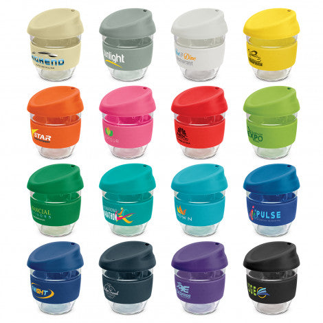 - Elegant 250ml reusable borosilicate glass coffee cup with a secure push on silicone lid and a wide heat-resistant silicone band.